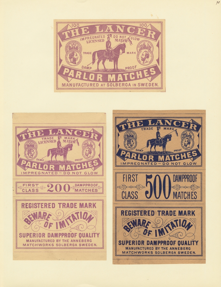 Etiketter för tändsticksaskar, från Svenskt Industri- och Handelsmuseum.
