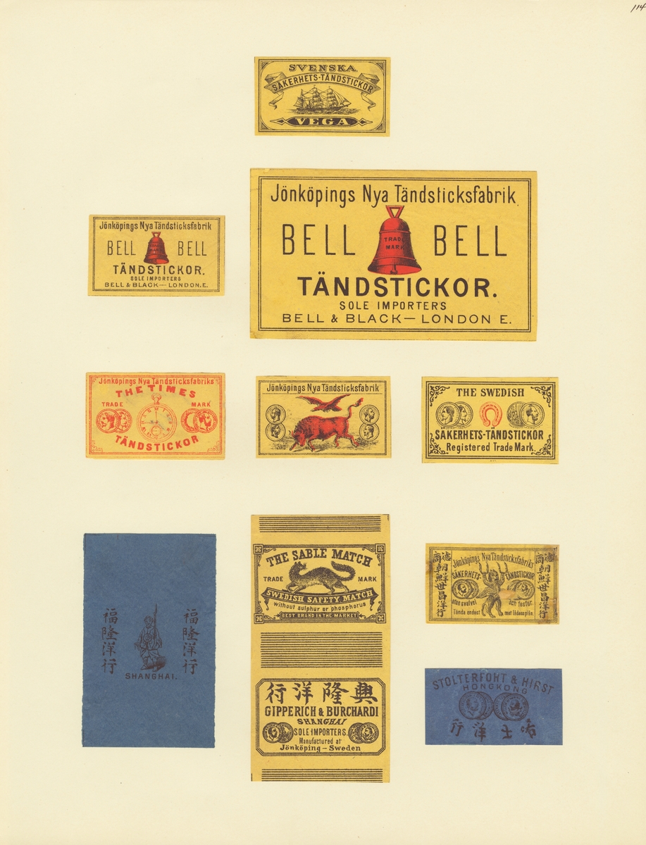 Titel: Etiketter för tändsticksaskar, från Svenskt Industri- och Handelsmuseum. (Jönköpings Nya Tändsticksfabrik).