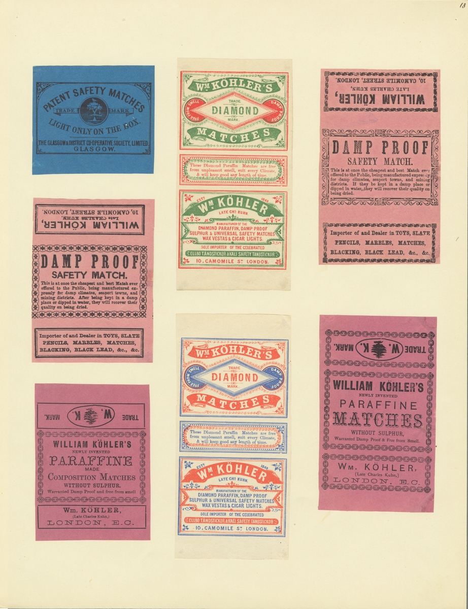 Etiketter för tändsticksaskar, från Svenskt Industri- och Handelsmuseum.