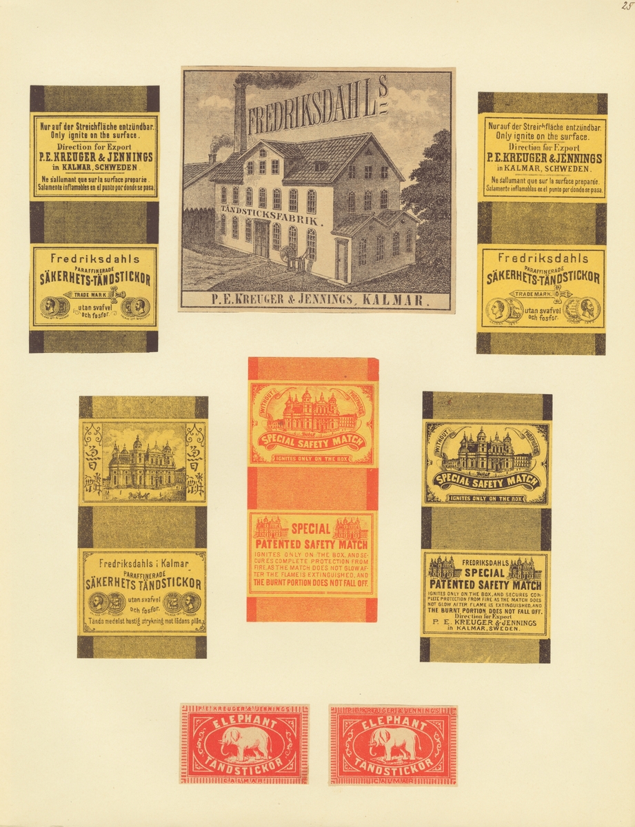 Titel: Etiketter för tändsticksaskar, från Svenskt Industri- och Handelsmuseum. (Fredriksdahls Tändsticksfabriks).