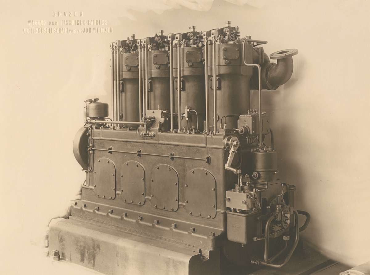 4-cylindrig Dieselmotor. HSS 34/4 kompressorseite. "Grazer, Waggon und Maschinen Fabriks Aktiengesellschaft vormals Joh. Weitzer".