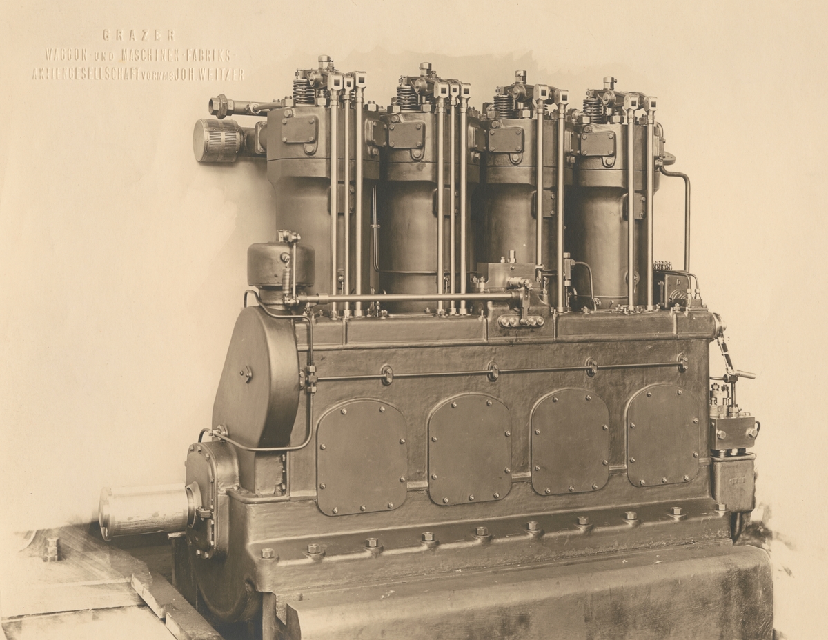 4-cylindrig dieselmotor. HSS 34/4 Antriebseite. "Grazer, Waggon und Maschinen Fabriks Aktiengesellschaft vormals Joh. Weitzer".