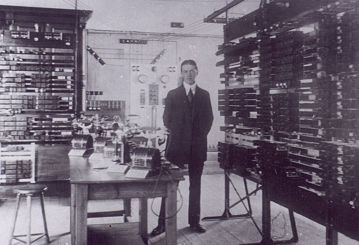 Nya AB Automattelefon Betulander, Stockholm (Liljeholmen) april 1915. Ingenjör Palmgren vid provanläggningen för mellanledningssystem.