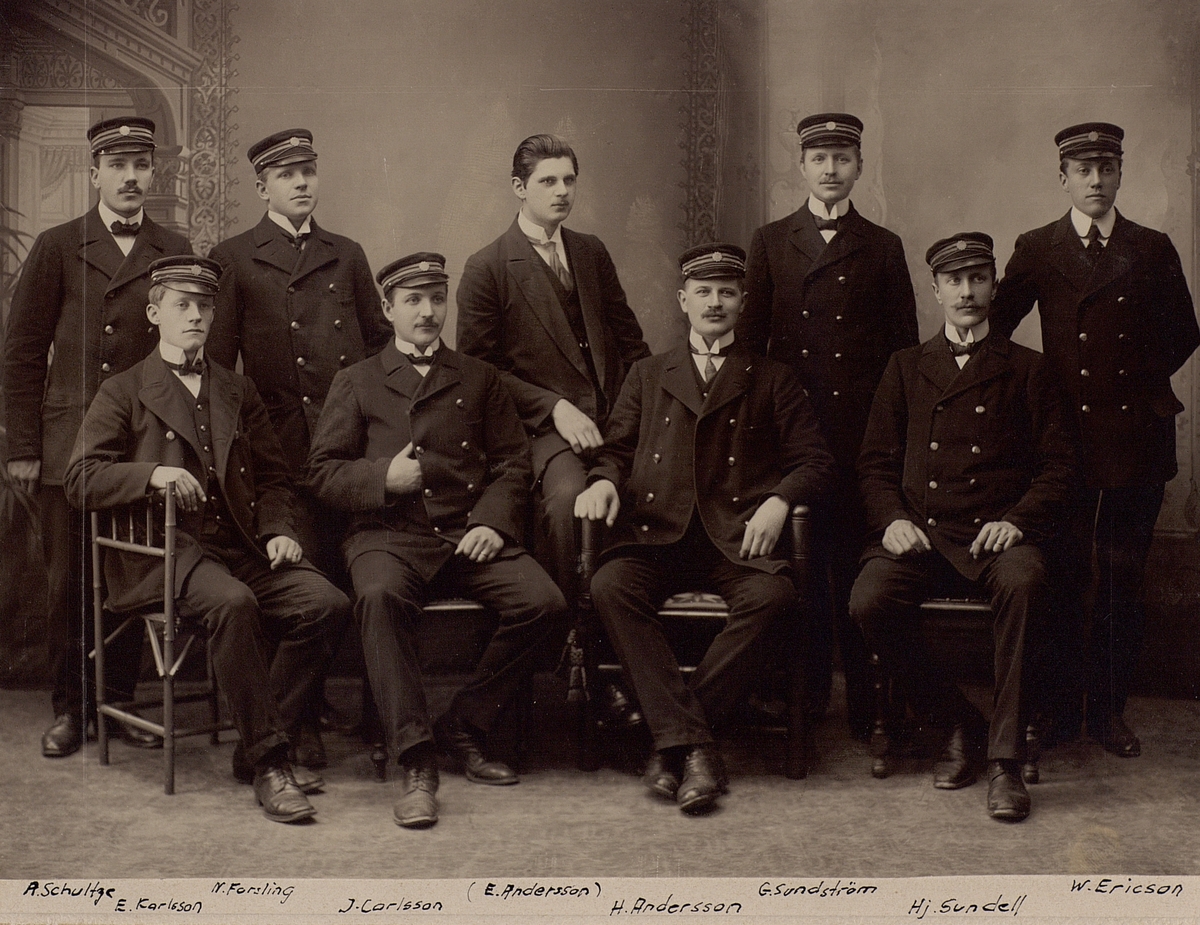 En grupp inkasserare vid AB Stockholmstelefon år 1910. Stående f.v. A Schultze, N Forsling, E Andersson, G Sundström, W Ericson. Sittande f.v. E Karlsson, J Carlsson, H Andersson, Hj Sundell.