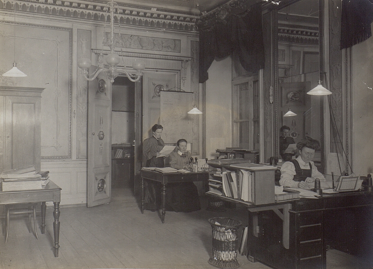 Telegrafisterna på Trafikbyrån, Järntorget. Ellen Malmberg. Lisa Bratt, Ingeborg Bahr. År 1900-1910.