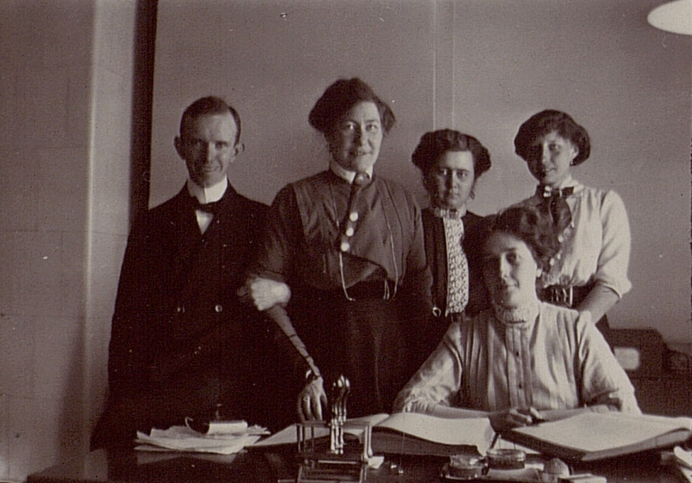 Telestyrelsen före 1916. Kalle Lénberg, Elisabet Sche- din, Hedely Carlberg, Karin Pyk, Greta Carlsson.