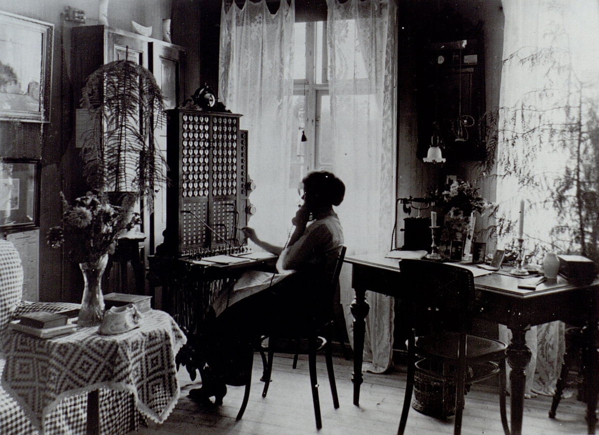 Ljungby. Telefonist Gerda Bengtsson i första telefonstationen år 1907-1908. Adam Johanssons fastighet vid torget.