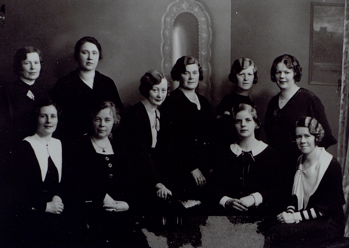 Telefonister vid Ljungby telefonstation i början av 1930-talet. Översta raden: Magda Tomsen, Inez Johansson, Signe Johansson, Kerstin Hedkvist, Veda Svensson och Lisa Karlsson. Nedre raden: Ingalisa Blomkvist, Gerda Bengtsson, Elsa Ring och Evy Gunnarsson.