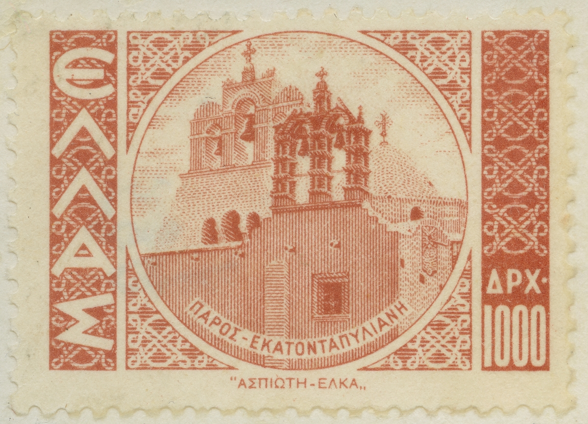 Frimärke från Grekland, 1942. Motiv av Ekatontapiliani Kyrkan på Paros.