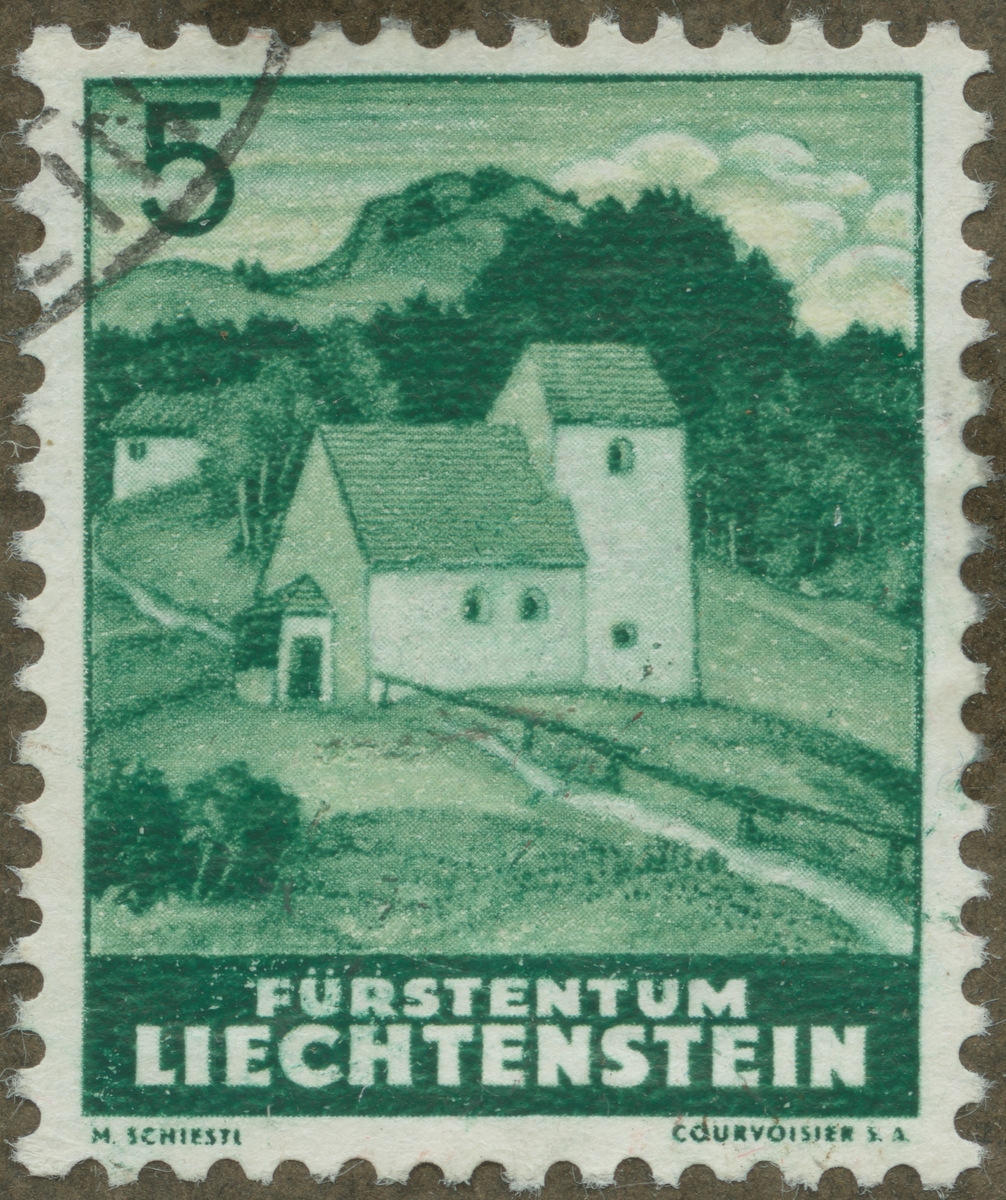 Frimärke från Liechtenstein, 1937. Motiv av kapellet i Masescha.