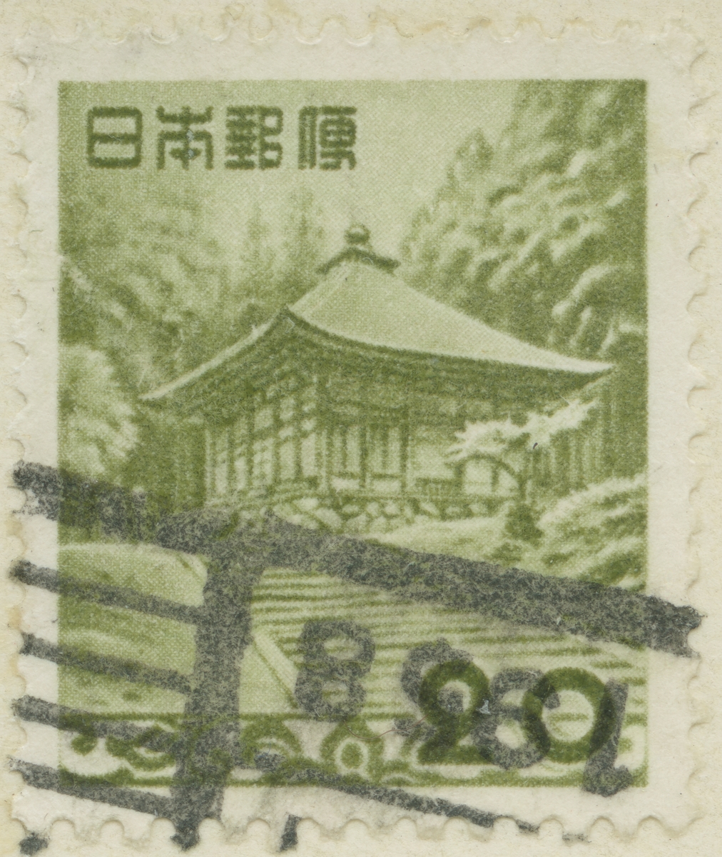 Frimärke från Japan, 1953. Motiv av Guldtemplet Chson-ji vid Hiraizumi.
