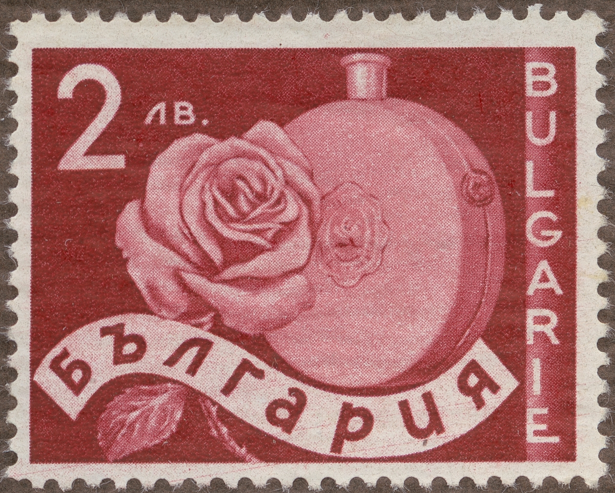 Frimärke från Bulgarien, 1938. Motiv av Ros och parfymflaska. "Propaganda för inhemska produkter".
