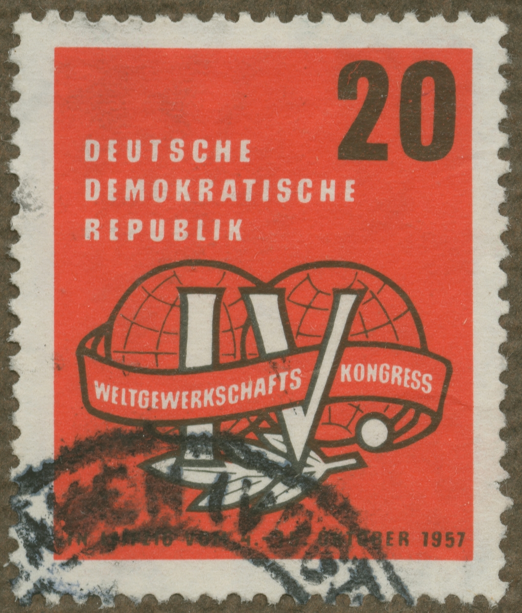 Frimärke från Östtyskland, 1957. Motiv av jordglober. "Symboler för Weltgewerkschaftkongress 1957".