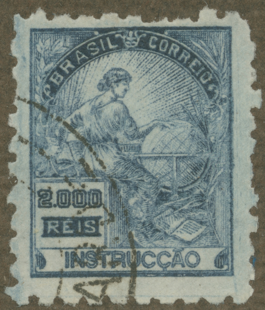 Frimärke från Brasilien, 1918. Motiv av kvinna vid jordglob. "Instruccao. Allergori: Skolväsen".