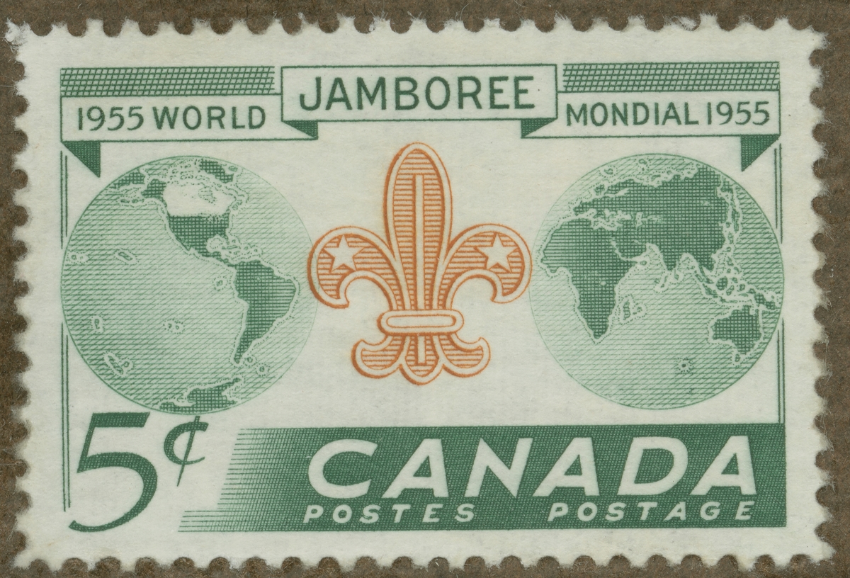 Frimärke från Canada, 1955. Motiv av scoutmärke. Två jordglobar. "Världs Jamboree 1955".
