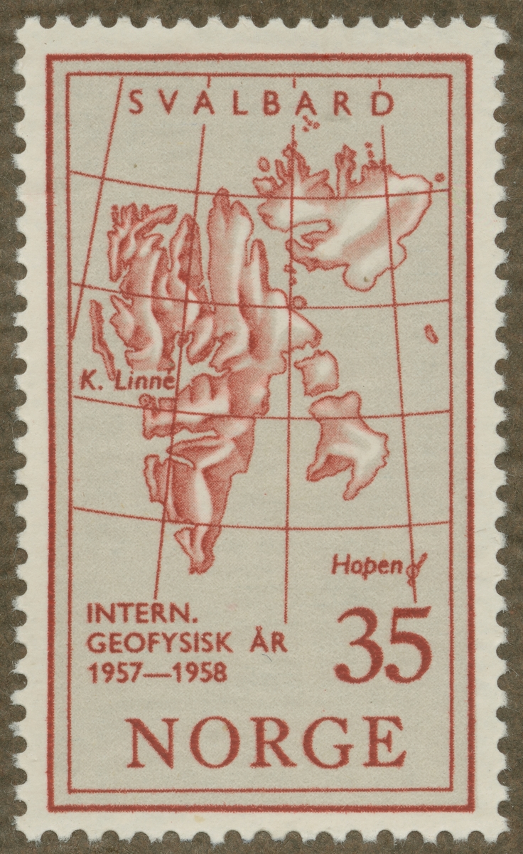 Frimärke från Norge, 1957. Motiv av karta över Svalbard och Spetsbergen. "Geofys. året 1957-58".
