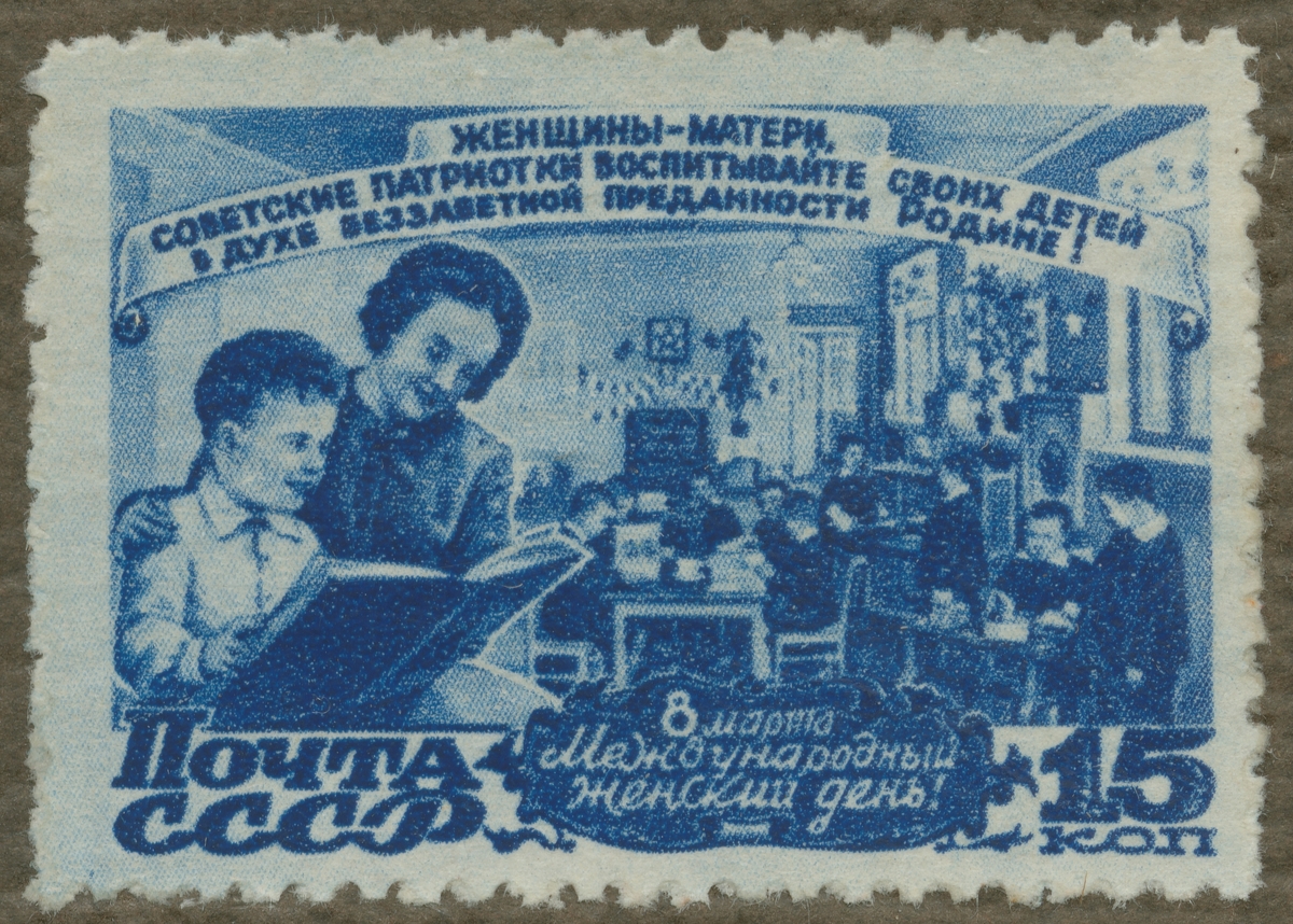 Frimärke från Ryssland, 1947. Motiv av skolundervisning av lärare i Ryssland.
