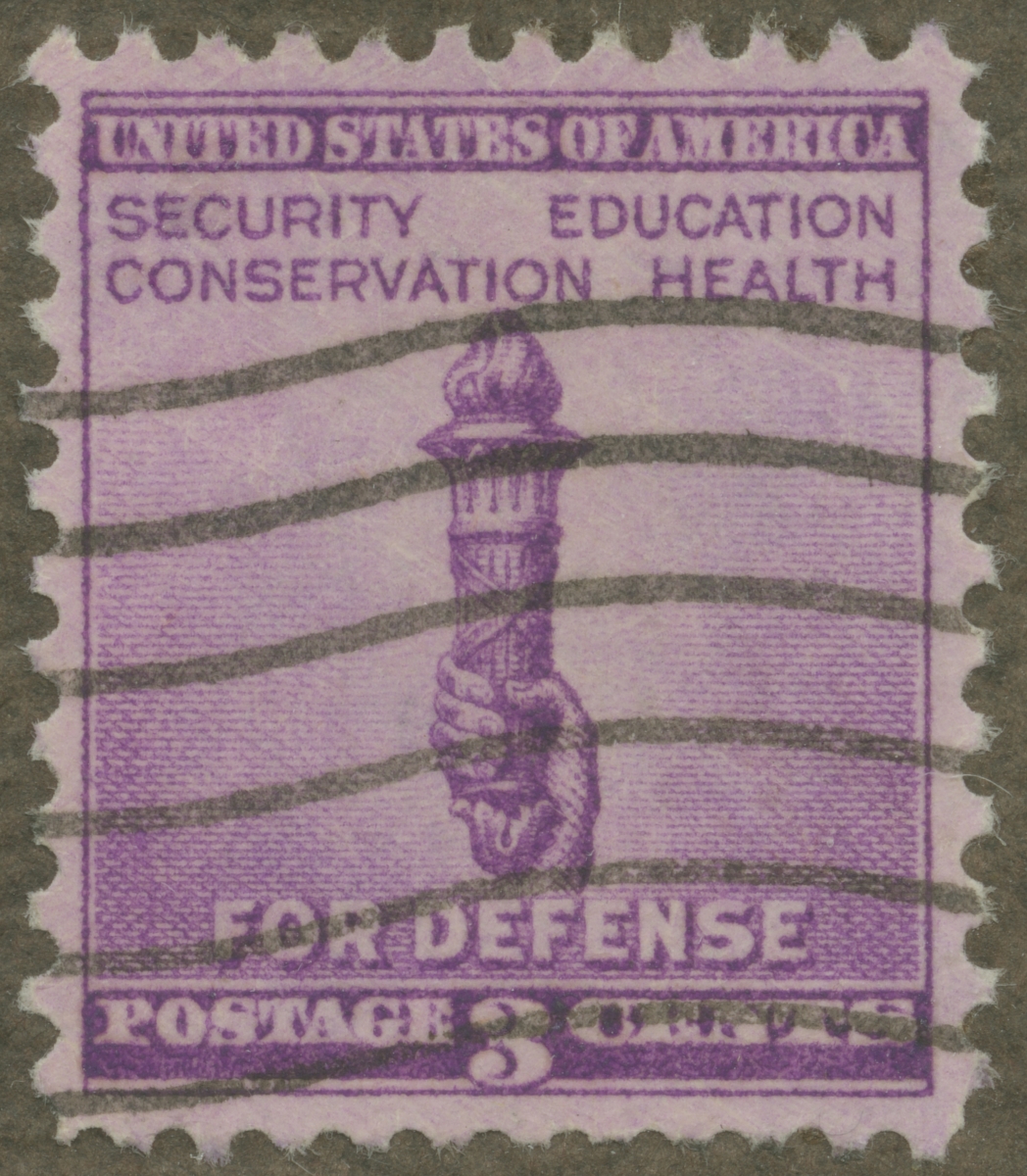 Frimärke från USA, 1940. Motiv av hand med fackla. "Säkerhet, uppfostran. hälsa".