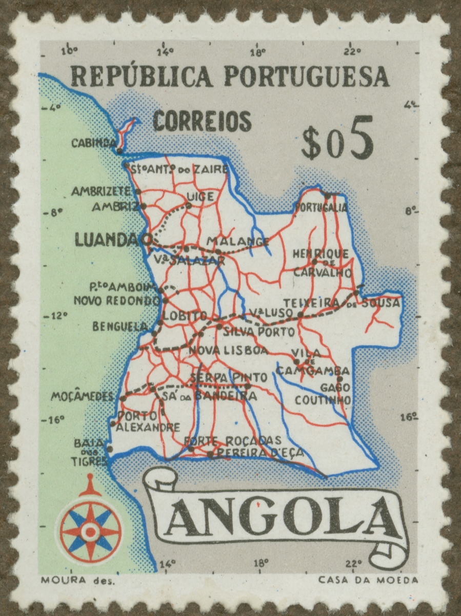 Frimärke från Portugisiska S.V. Afrika, Angola, 1955. Motiv av karta över Angola.