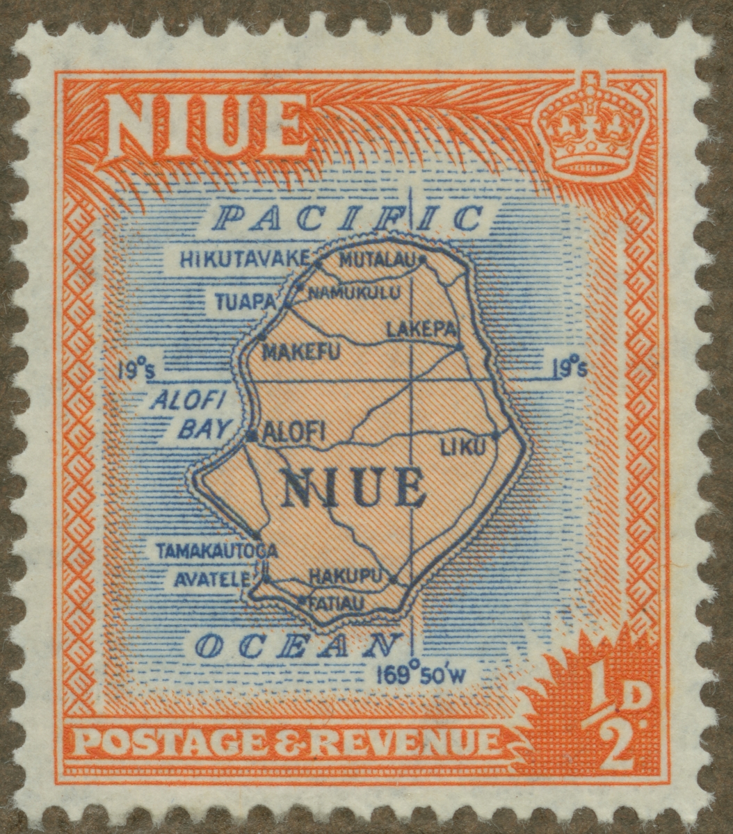 Frimärke från Niua, Nya Zeeland, 1950. Motiv av karta över Niueön i sydliga Stilla Havet.