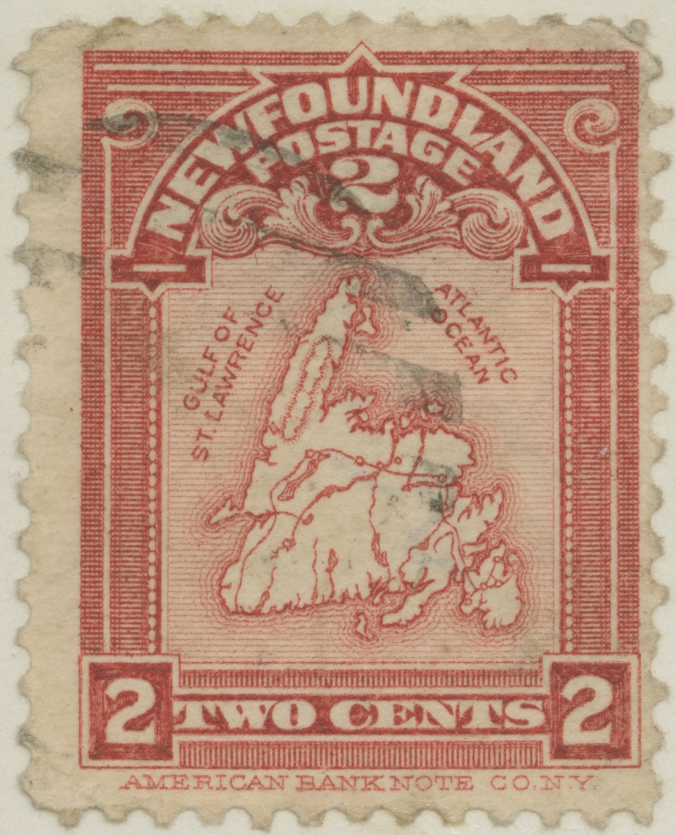 Frimärke från New Foundland, 1908. Motiv av karta över New Foundland.