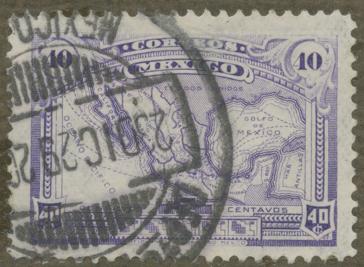 Frimärke från Mexico, 1915. Motiv av karta över Mexikanska Golfen.