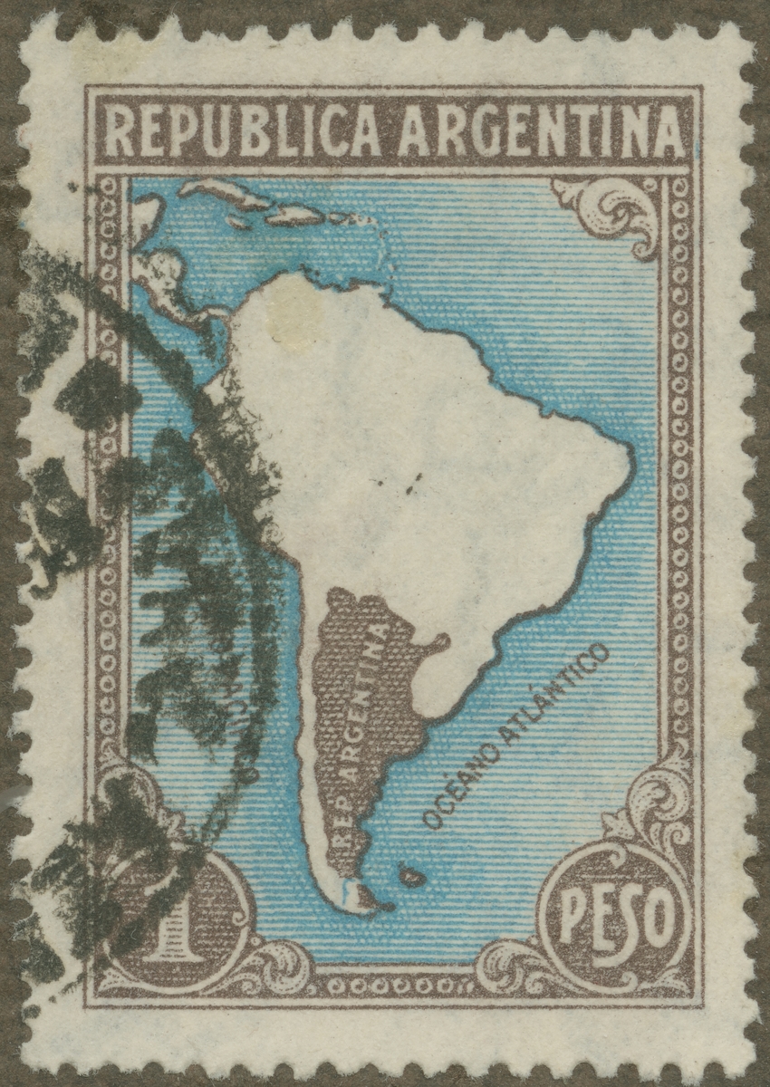Frimärke frånArgentina, 1935. Motiv av Argentina på Sydamerikas karta.