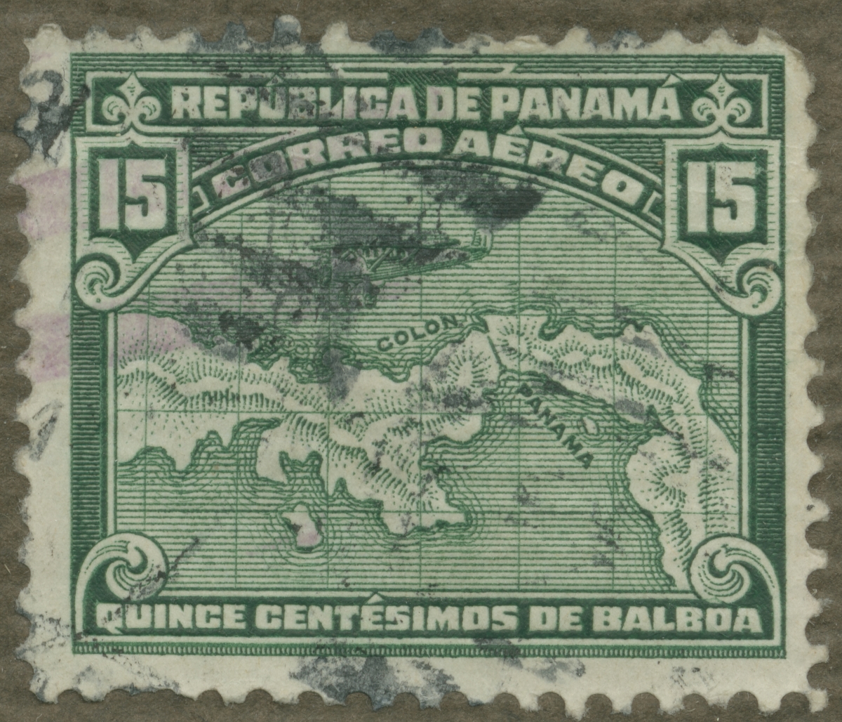 Frimärke från Panama, 1929. Motiv av flygplan över Panamas karta.