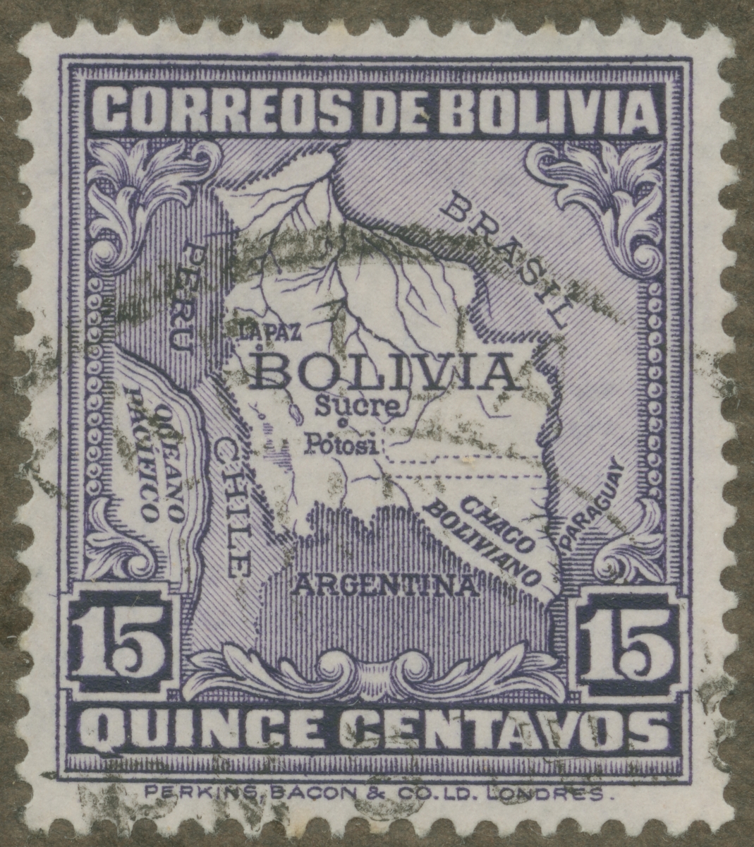 Frimärke från Bolivia, 1931. Motiv av karta över Bolivia.