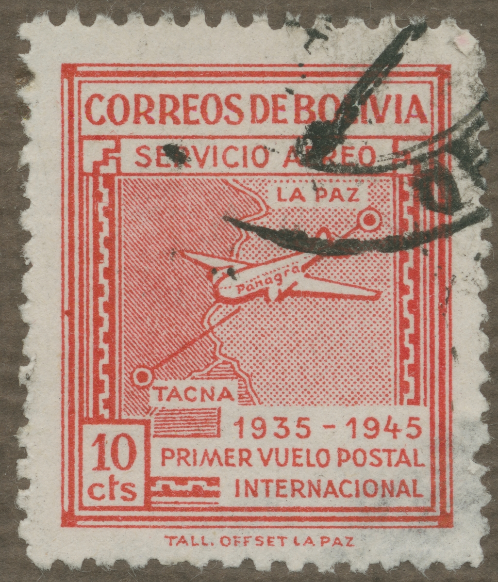 Frimärke från Bolivia, 1945. Motiv av monoplan på rutten La Paz - Tacna, Bolivia. "10-årsminne av den första flygningen mellan La Paz och New York, juni, 1935".