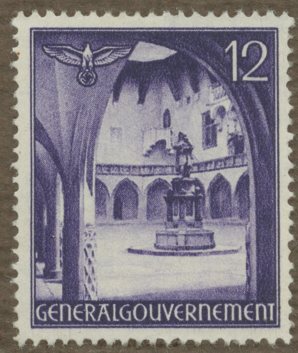 Frimärke från Generalguv. Polen, 1940. Motiv av gårdsinteriör från Coperniusinstitutet.