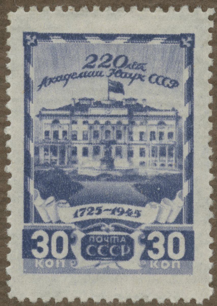 Frimärke från Ryssland, 1945. Motiv av Akademien i Moskwa. "1725-1945, 220 årsminne".