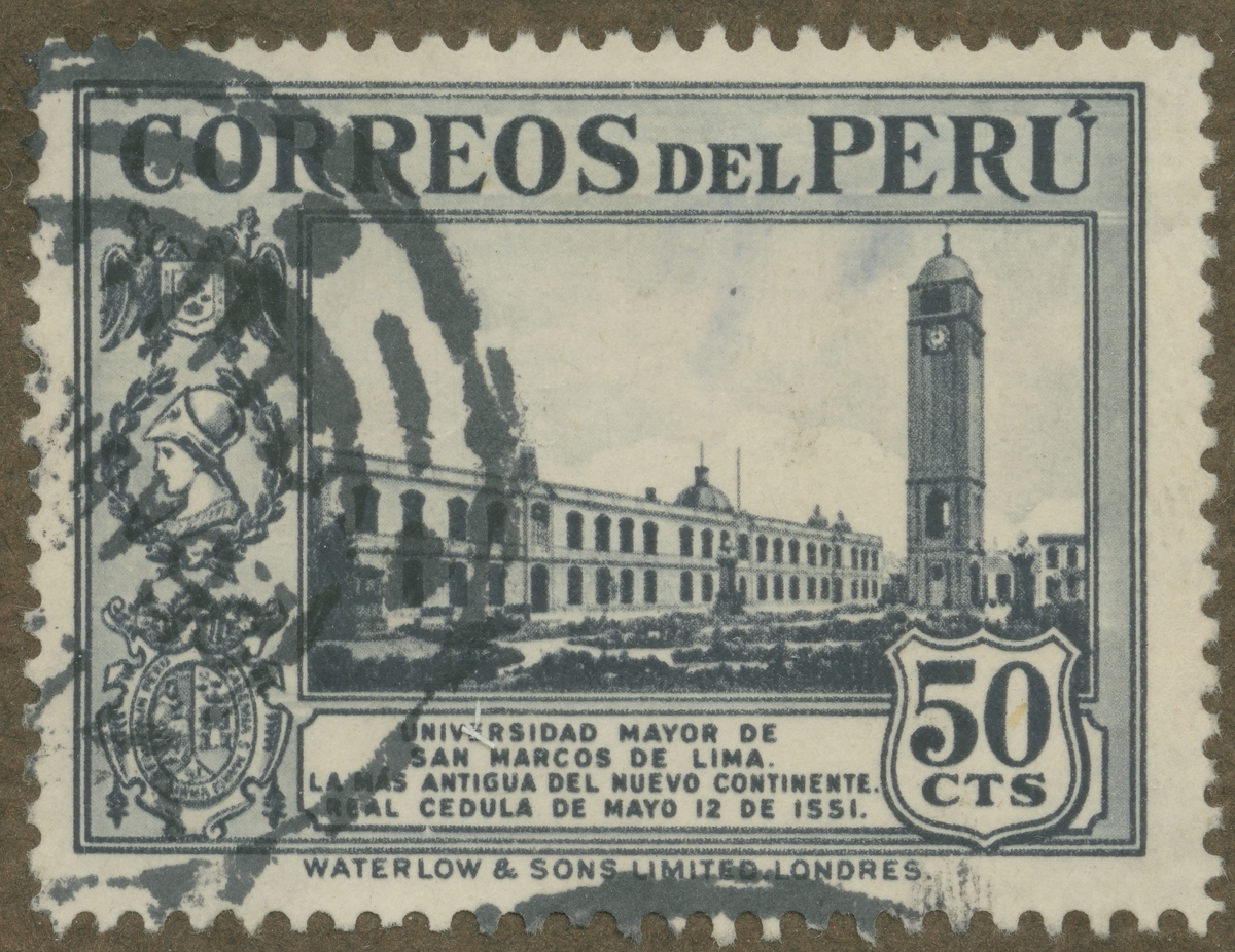 Frimärke från Peru, 1936. Motiv av San Marcus Universitetet i Lima, grundat d. 12 maj 1551.