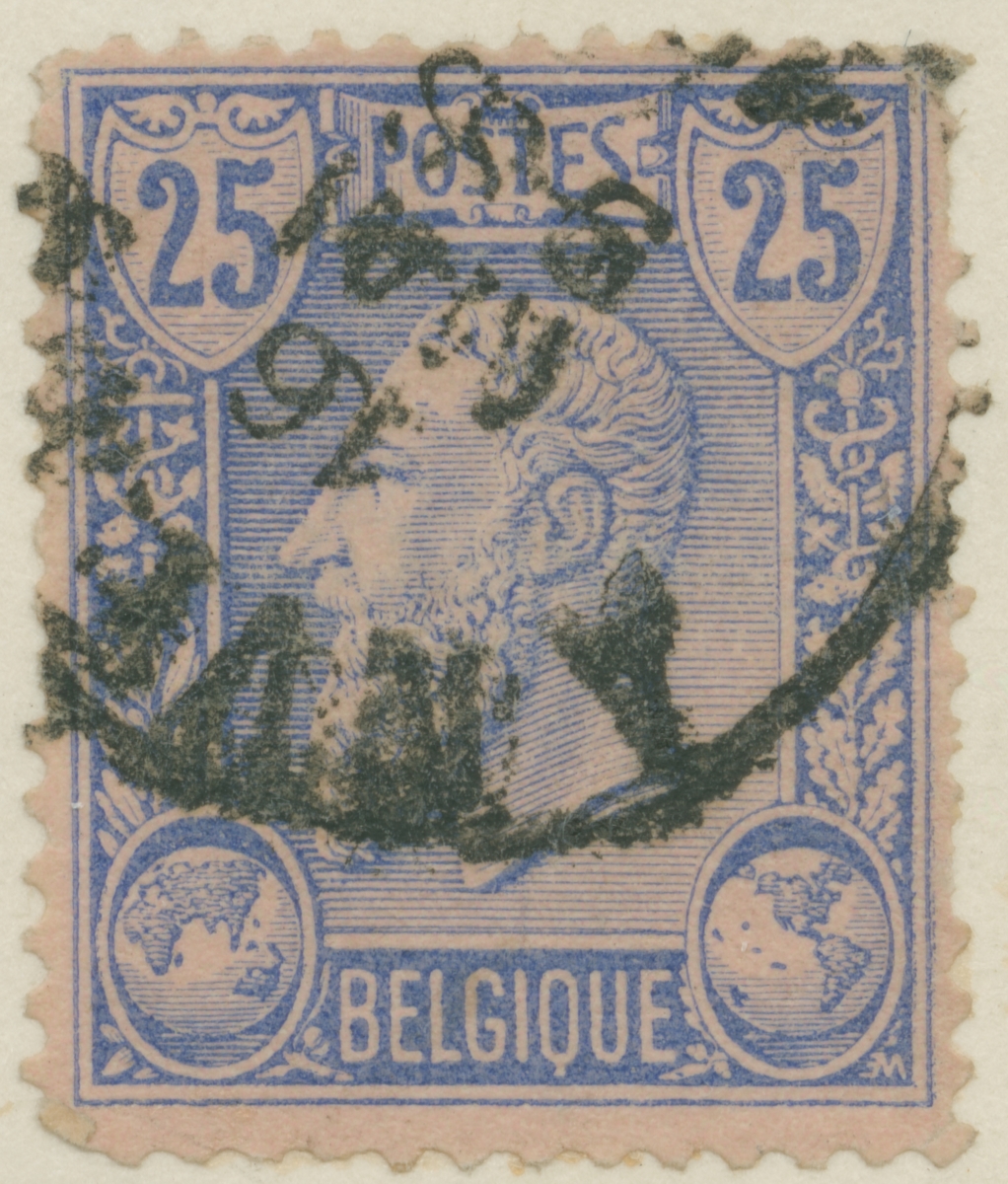 Frimärke från Belgien, 1884. Motiv av östra halvklotet och västra halvklotet.