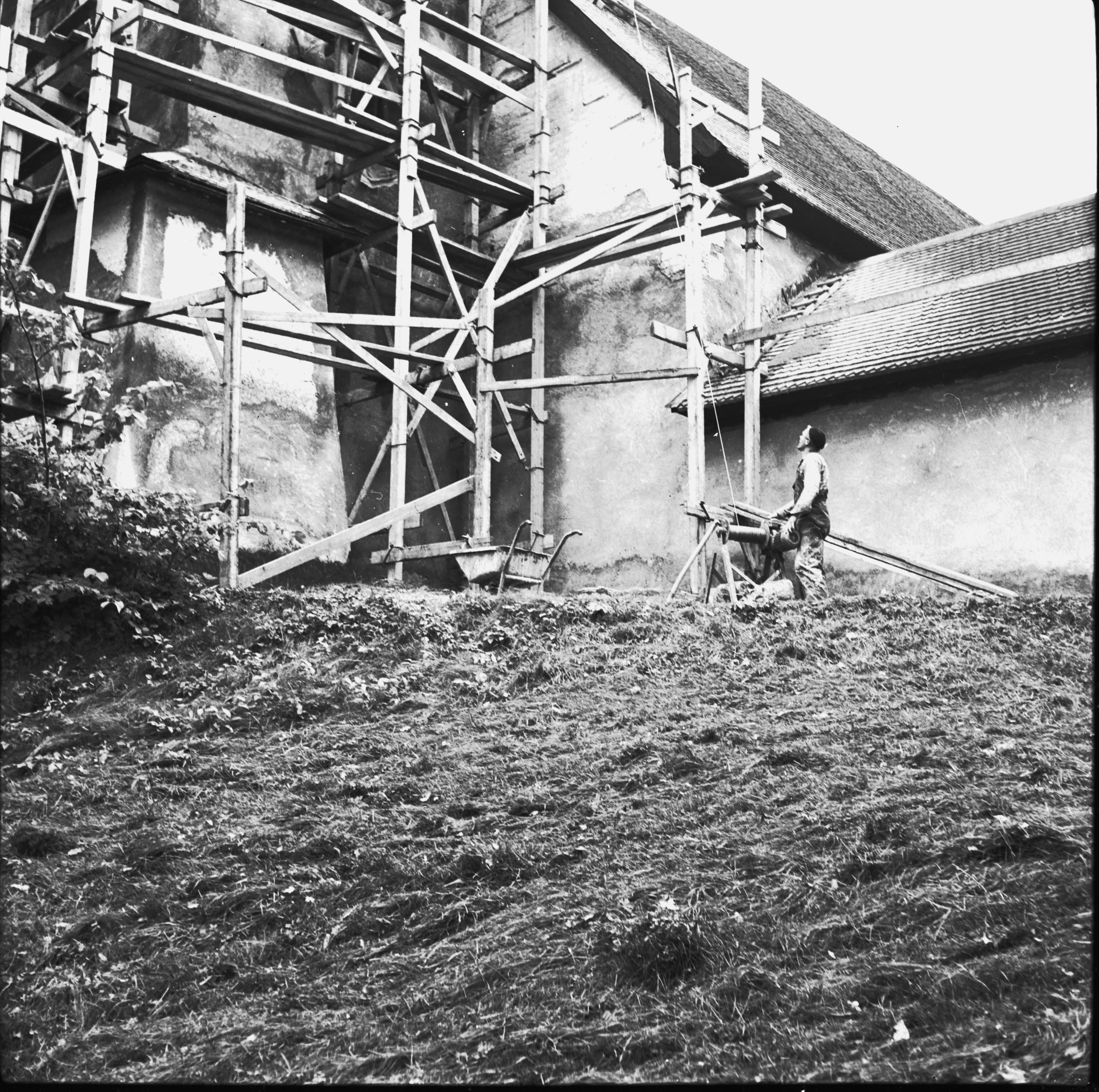 Långhusets västra fasad, under arbete med slätputsning av kyrkan.