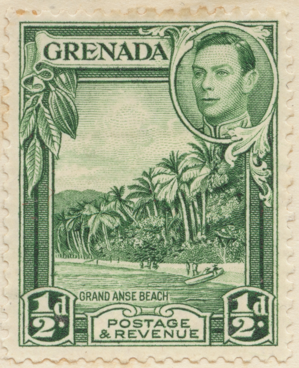 Frimärke från Grenada, 1938. Motiv av strand med palmer: Grand Anse Beach. T.h. Kung George VI.