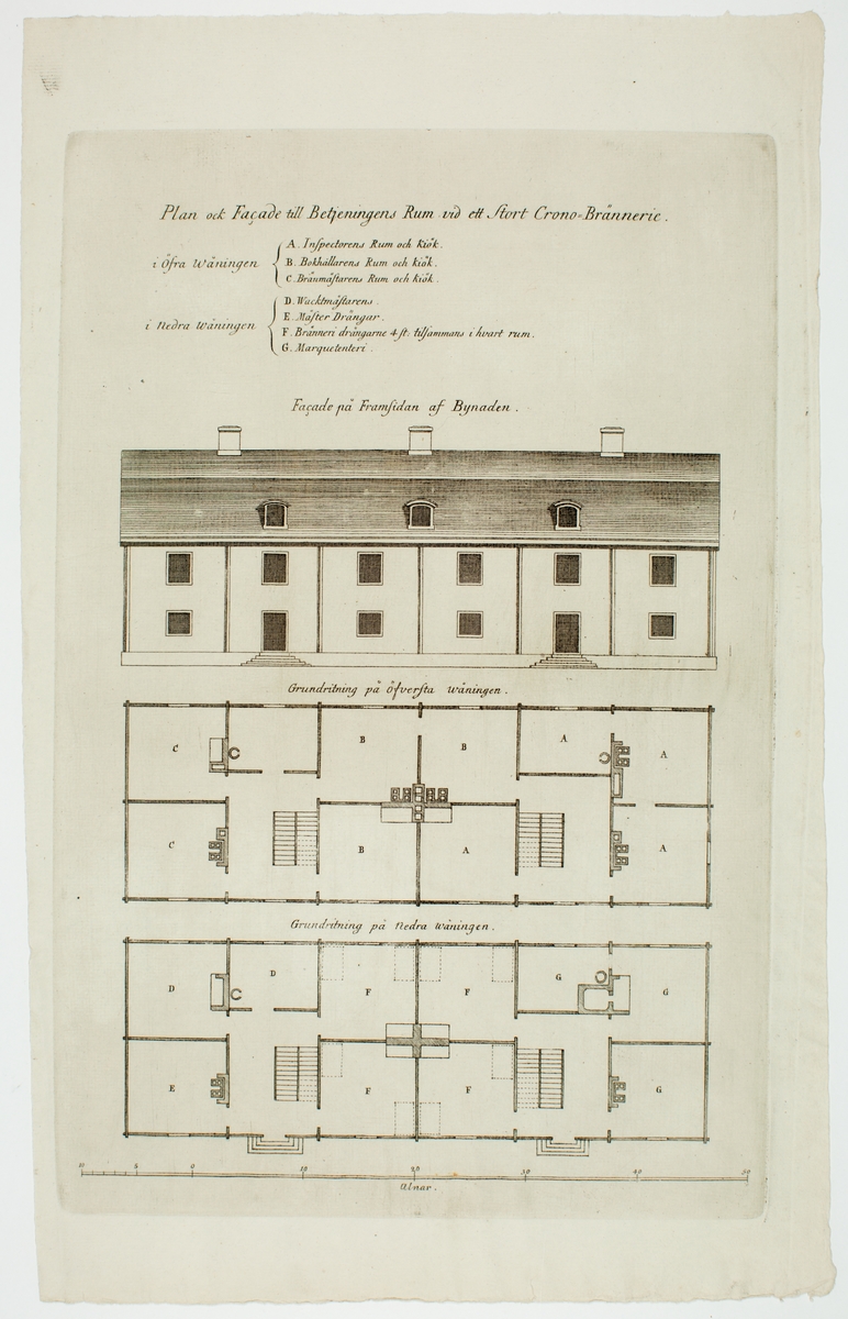 Ritning. "Plan ock Facad till Betjeningens Rum vid ett Stort Crono-Brännerie".Ur Carl Johan Cronstedts samling.