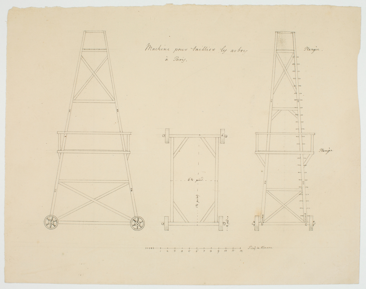 Ritning. Maskin för att beskära träd. Ur Carl Johan Cronstedts samling.