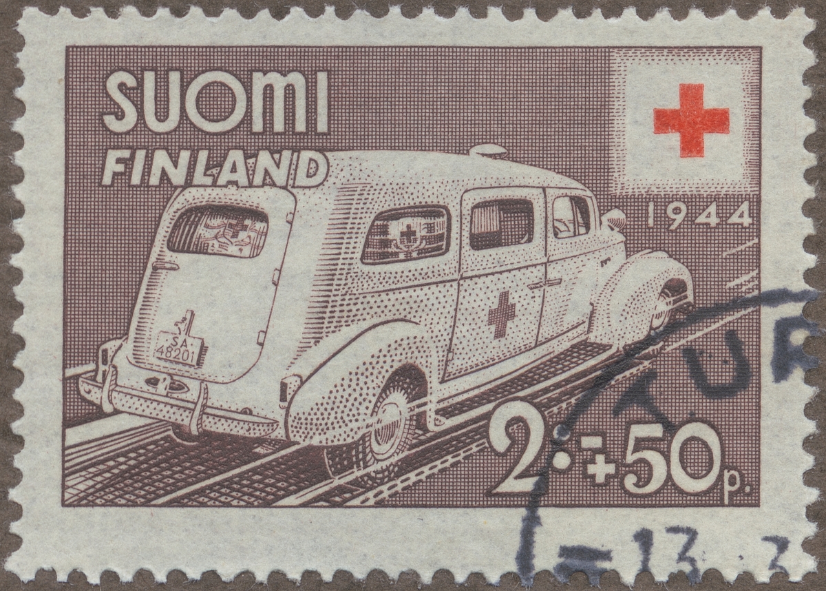 Frimärken ur Gösta Bodmans filatelistiska motivsamling, påbörjad 1950. Frimärke från Finland, 1944. Motiv av Finsk Ambulansbil