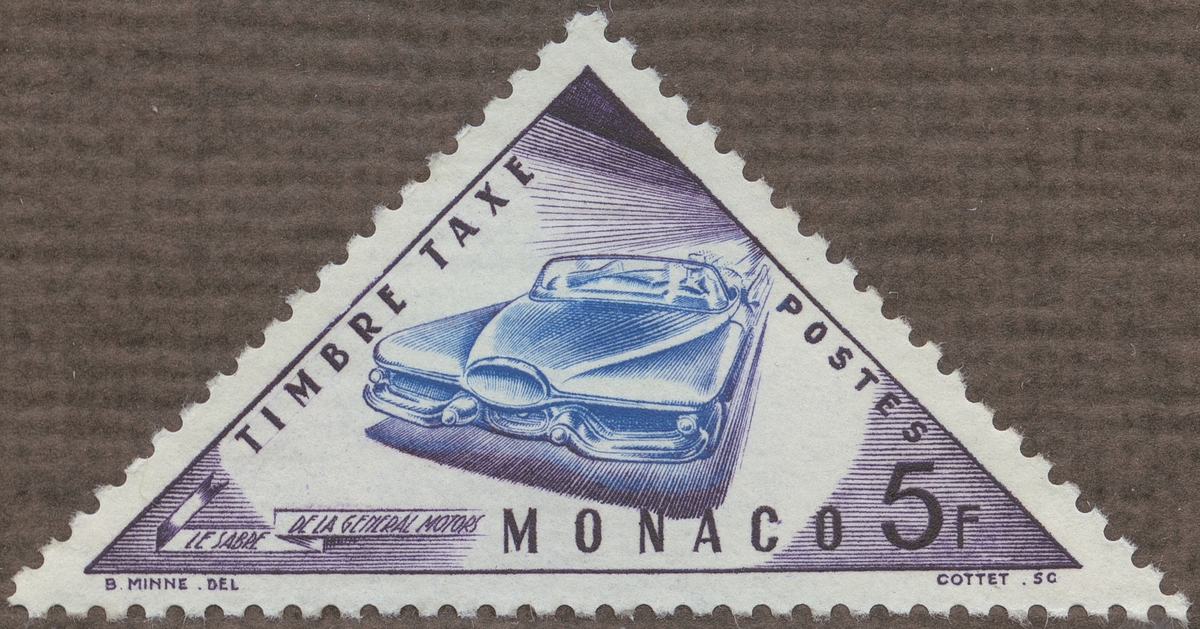 Frimärken ur Gösta Bodmans filatelistiska motivsamling, påbörjad 1950. Frimärke från Monaco, 1953. Motiv av Bilmärket "Sabre" från General Motors.