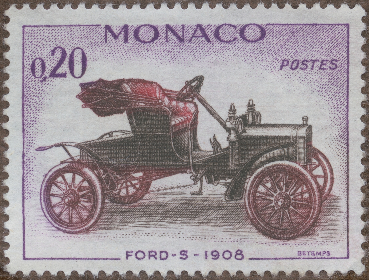 Frimärken ur Gösta Bodmans filatelistiska motivsamling, påbörjad 1950. Frimärke från Monaco, 1961. Motiv av Ford-S: 1908