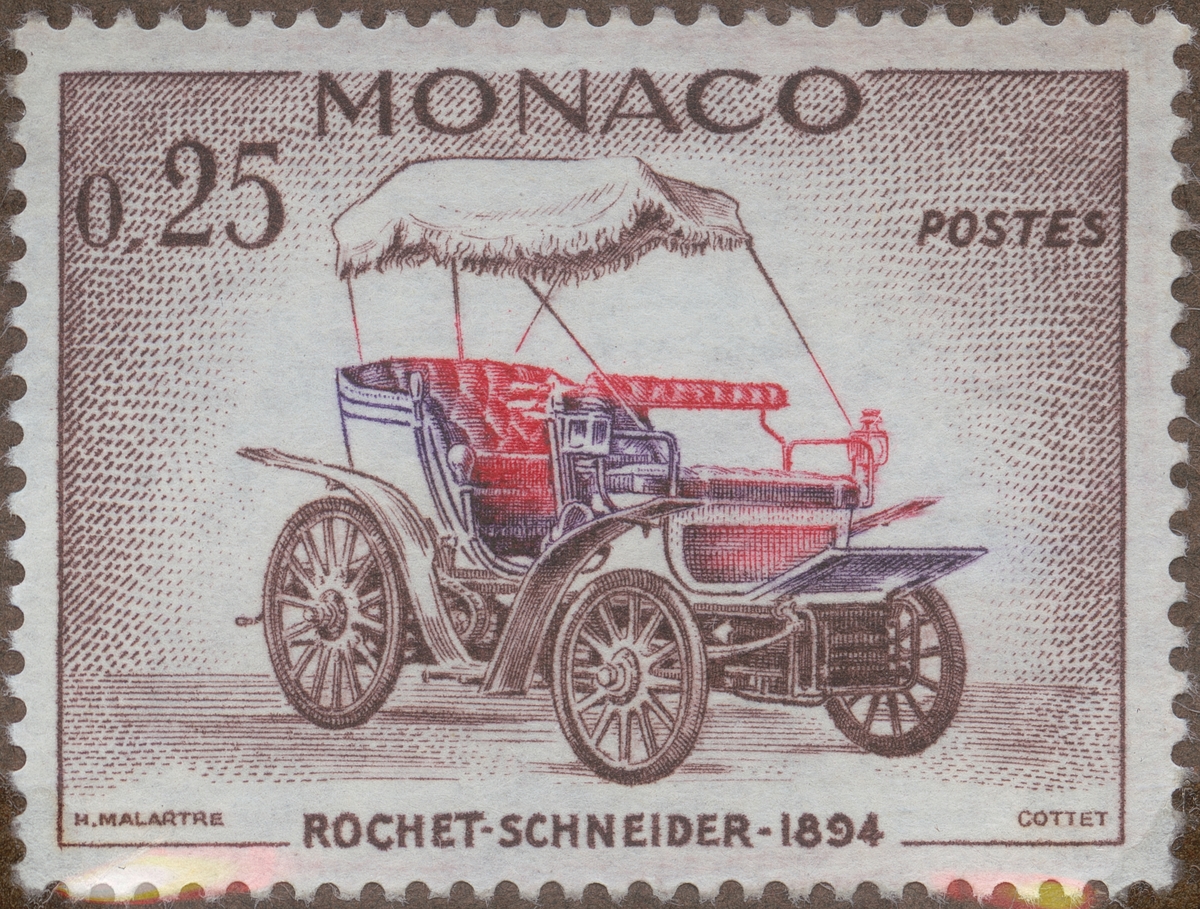 Frimärken ur Gösta Bodmans filatelistiska motivsamling, påbörjad 1950. Frimärke från Monaco, 1961. Motiv av Rochet- Schneider: 1894