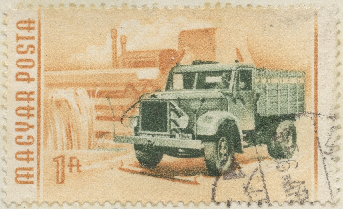 Frimärken ur Gösta Bodmans filatelistiska motivsamling, påbörjad 1950. Frimärke från Ungern, 1955. Motiv av Lantbruks lastbil framför fabrik