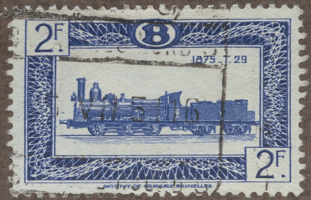 Frimärken ur Gösta Bodmans filatelistiska motivsamling, påbörjad 1950. Frimärke från Belgien, 1949. Motiv av Lokomotiv Belgien 1875 T. 29