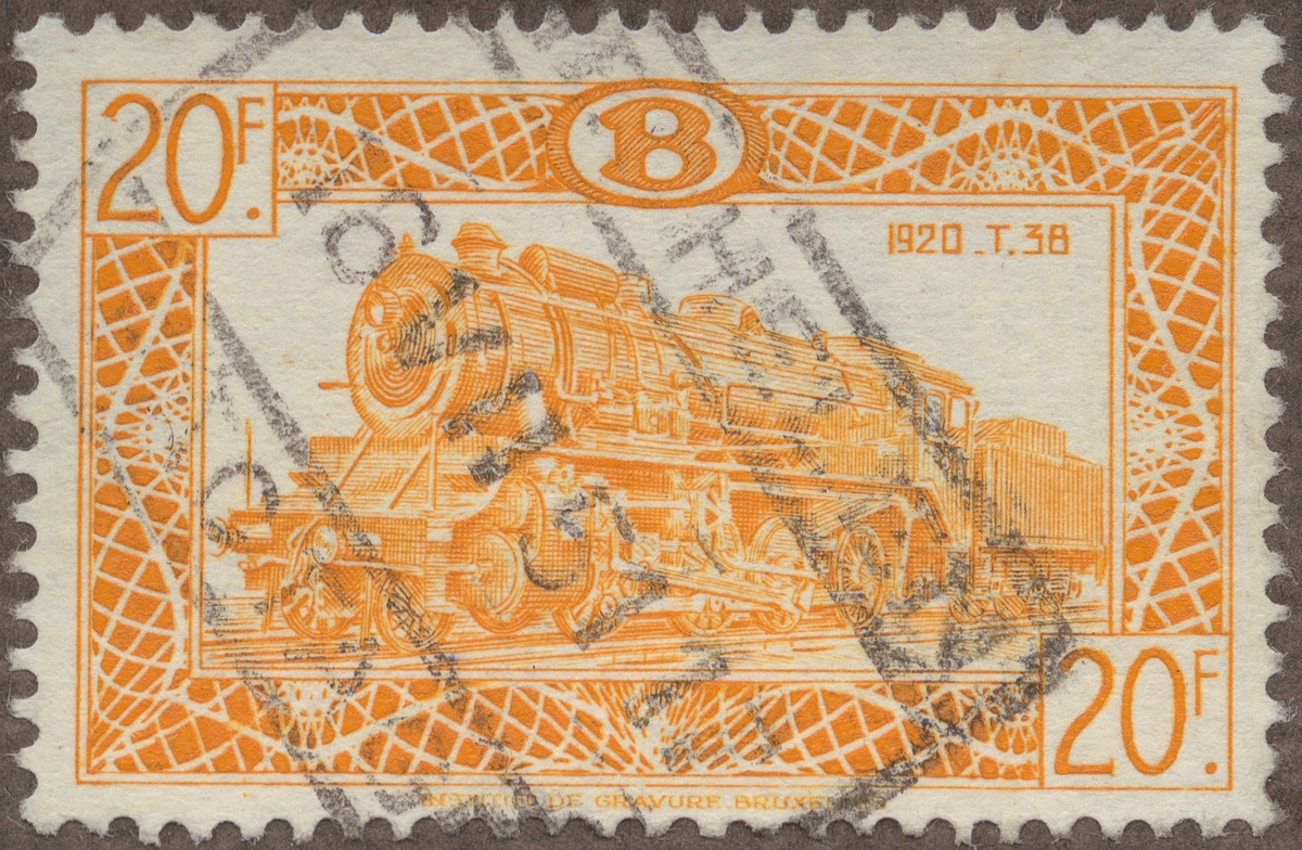 Frimärken ur Gösta Bodmans filatelistiska motivsamling, påbörjad 1950. Frimärke från Belgien, 1949. Motiv av Lokomotiv Belgien 1920 T 36