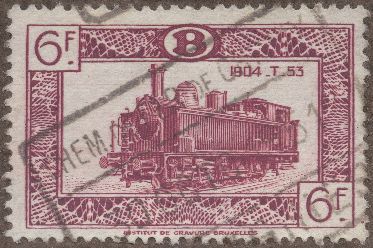 Frimärken ur Gösta Bodmans filatelistiska motivsamling, påbörjad 1950. Frimärke från Belgien, 1949. Motiv av Lokomotiv Belgien 1904 T 53