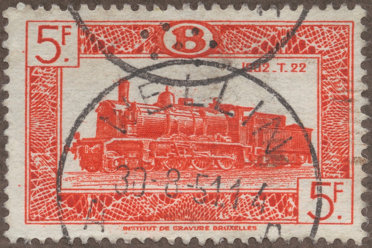 Frimärken ur Gösta Bodmans filatelistiska motivsamling, påbörjad 1950. Frimärke från Belgien, 1949. Motiv av Lokomotiv Belgien 1902 T. 22.