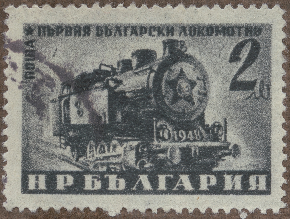 Frimärken ur Gösta Bodmans filatelistiska motivsamling, påbörjad 1950. Frimärke från Bulgarien, 1950. Motiv av Bulgariskt Ånglok av 1948.