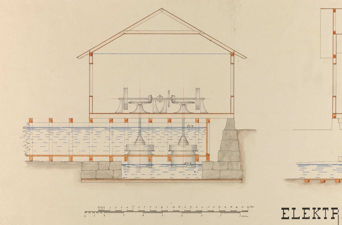 Delförstoring av ritning över förslag till Lindesbergs elektricitetsverk.
