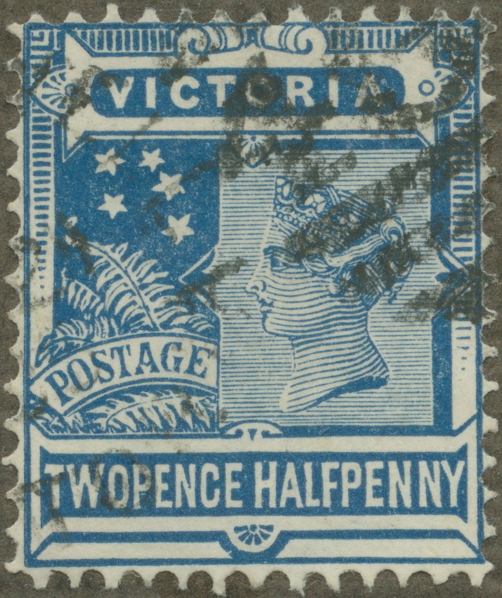 Frimärke ur Gösta Bodmans filatelistiska motivsamling, påbörjad 1950. Frimärke från Victoria (Australien), 1899. Motiv av Stjärnbilden "Södra Korset"